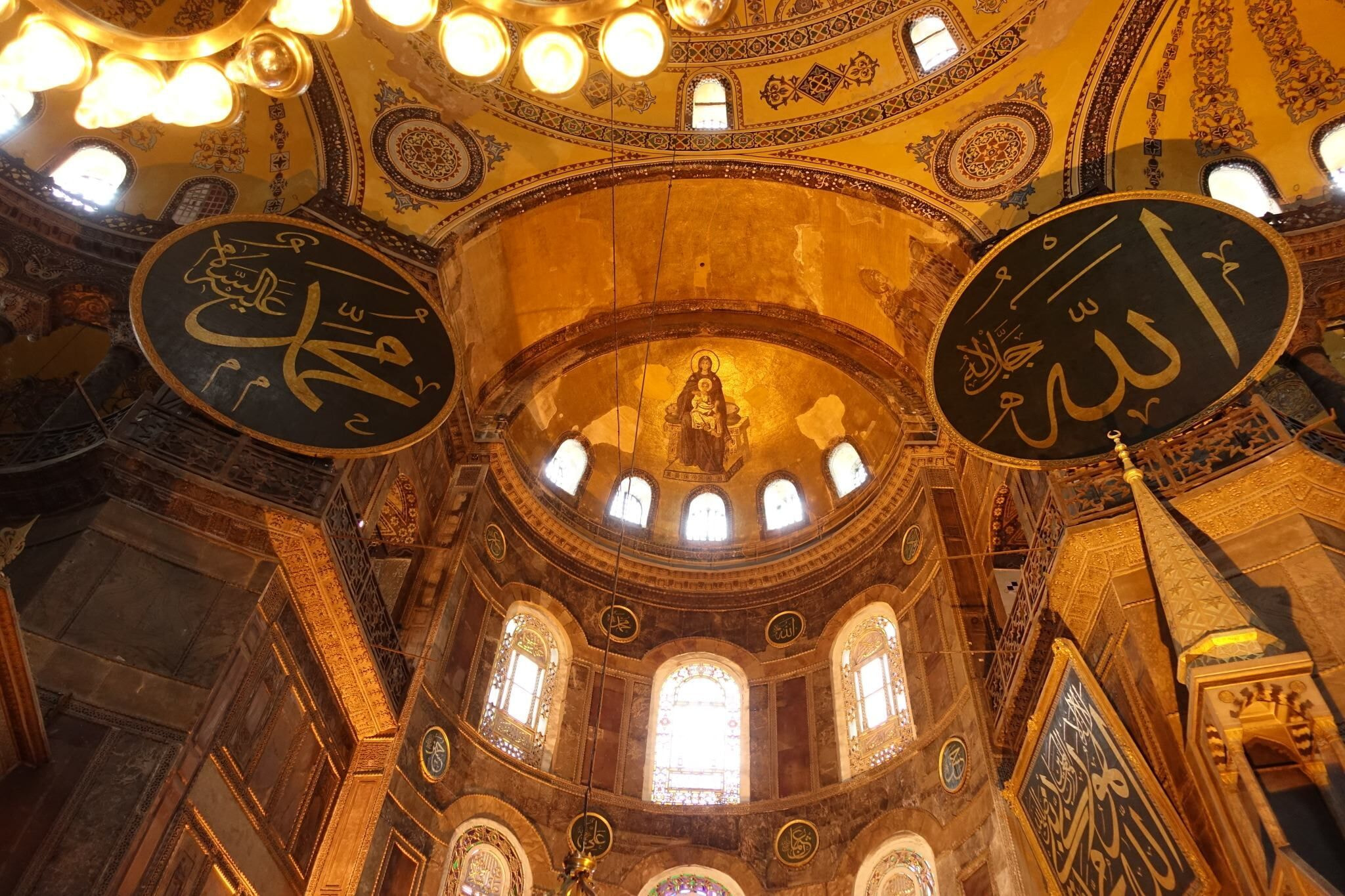 Inside Hagia Sophia (which means Holy Wisdom), a fascinating megastructure that is nearly 1,500 years old. It was built as a cathedral in the 6th century by Emperor Justinian, converted into a mosque in mid-15th century, and eventually made into a museum in 1935. Hence the mosaic of the Virgin Mary, flanked by two round panels with “Allah” and “Prophet Muhammad”. (The Virgin Mary image was plastered over when this was a mosque.)