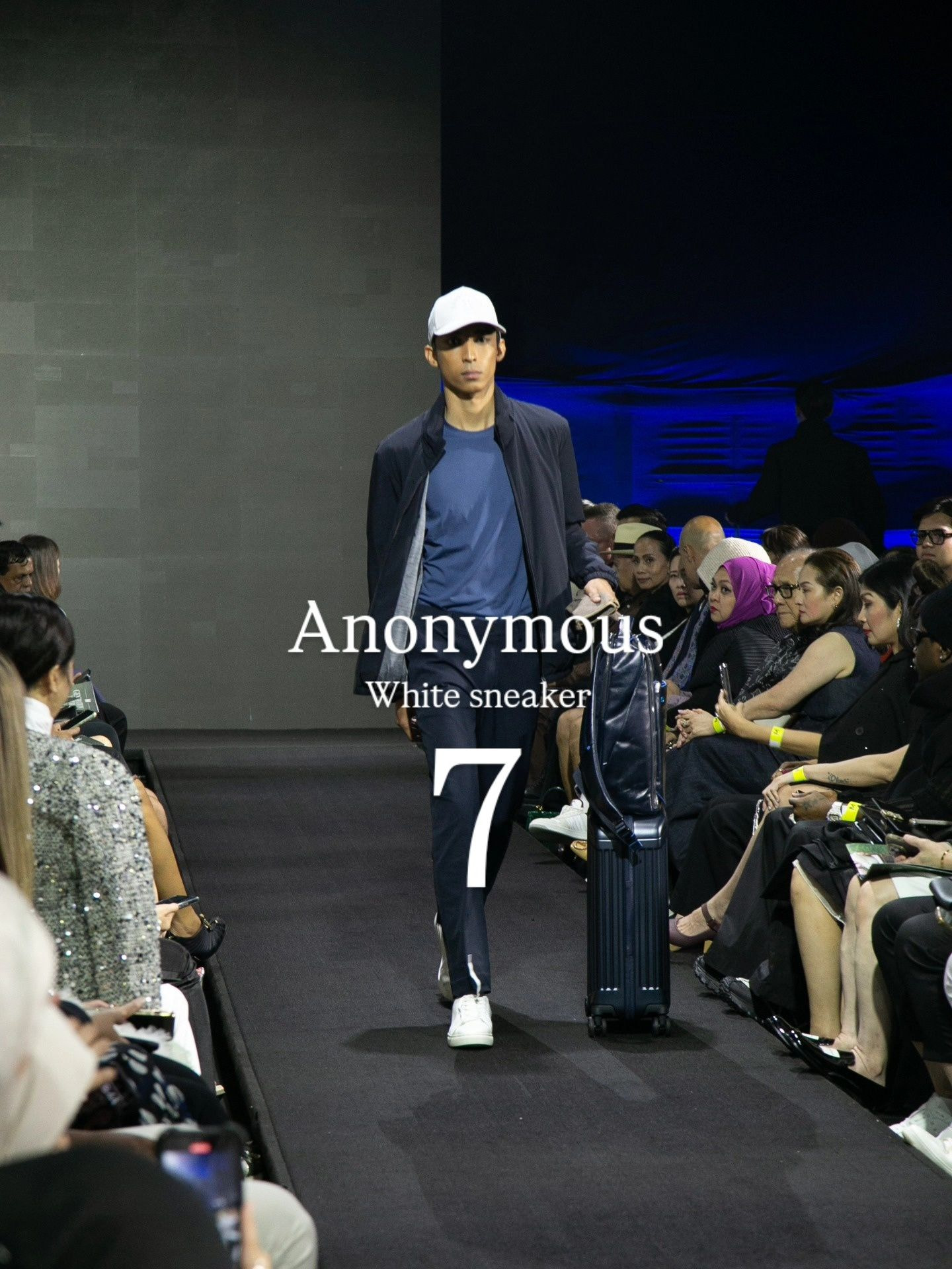 Observe this runway presentation: a masterclass in chromatic restraint. The white sneaker anchors a palette of midnight navy and slate grey, creating visual punctuation that draws the eye downward while maintaining overall harmony. This is not accident but architecture - the understanding that white functions as both foundation and exclamation, grounding darker tones while providing essential contrast.